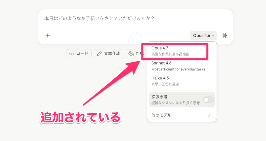 チャット画面のモデル選択メニューから「Opus 4.7」を選ぶだけです。インストールも手続きも不要。今すぐ使えます。